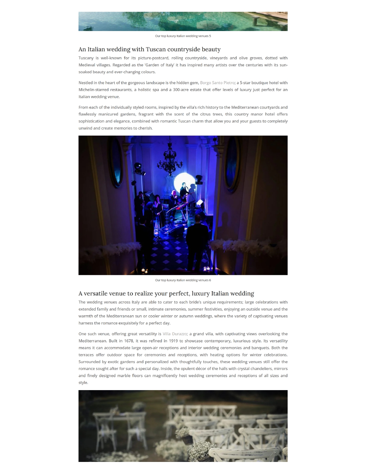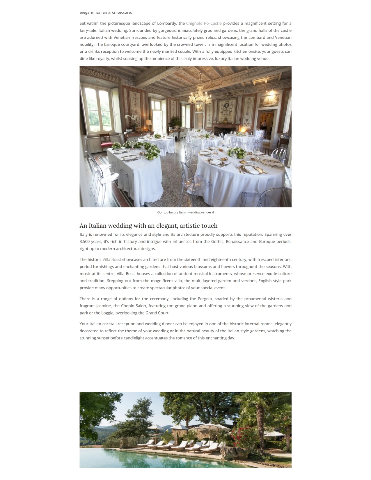 I wrote this luxury editorial feature for SugarEvents, showcasing six high-end Italian wedding venues through evocative, detailed descriptions designed to inspire couples planning a destination celebration.
